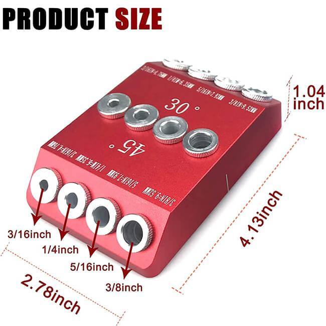 - FOUR SIZES OF GUIDE HOLES: There are four sizes of guide holes for each drilling angle, which are 3/8”(9.52mm), 5/16”(7.93mm), 1/4”(6.35) mm), 3/16"(4.76mm), compatible with most cable railing lag screws. In order to drill the angle hole more accurately, please use a drill of the corresponding size.